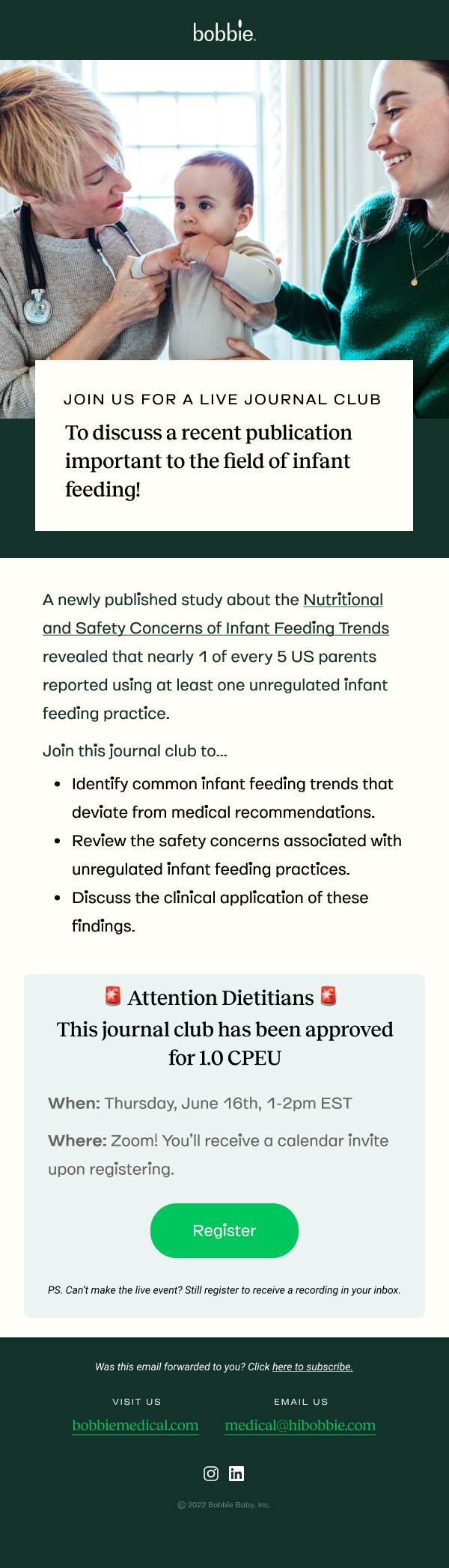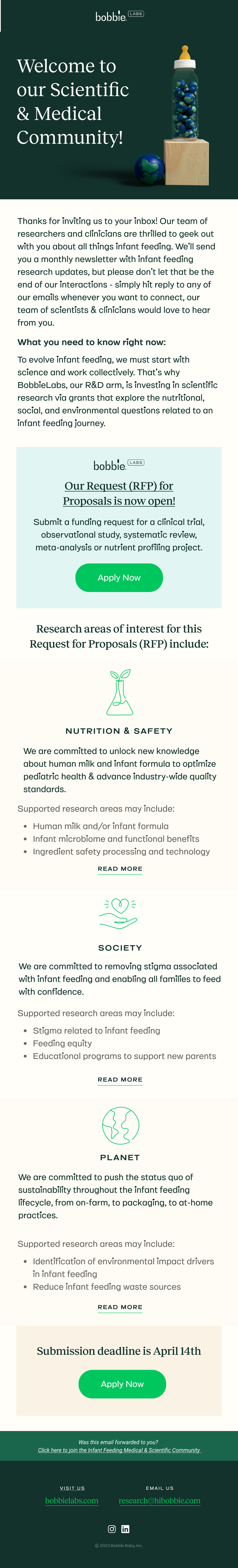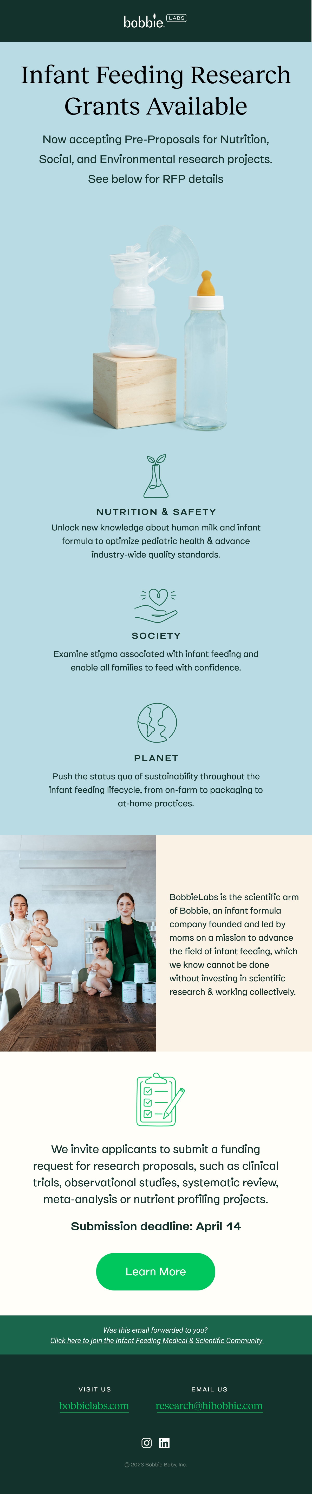 Bobbie Medical & Labs emails including emails for Request for Proposal, research for Universities, and Journal Clubs for nurses and pediatricians.