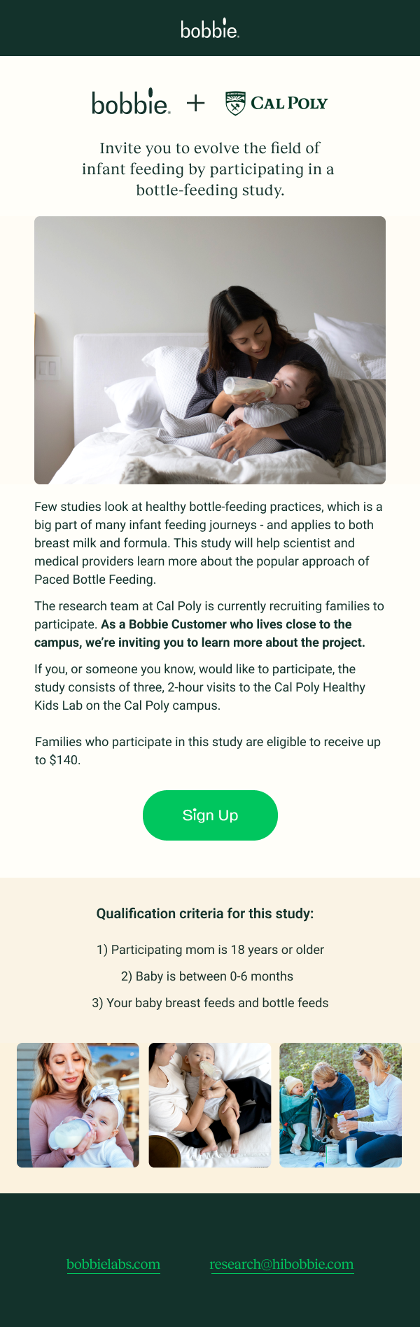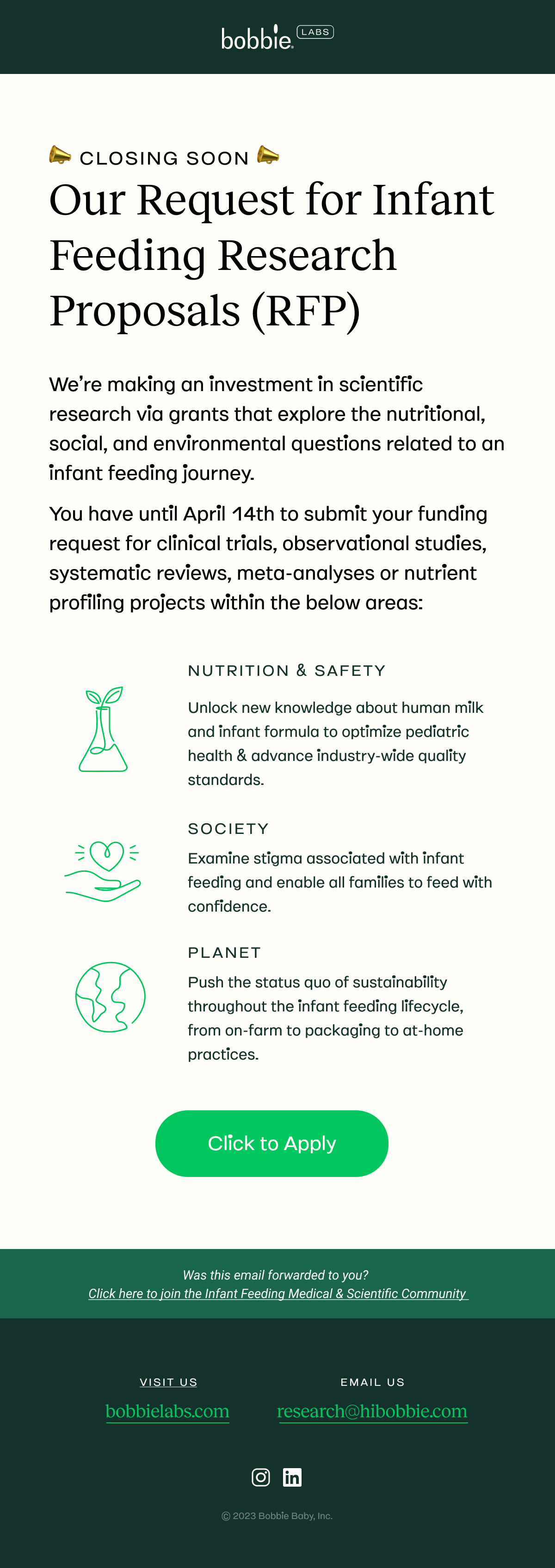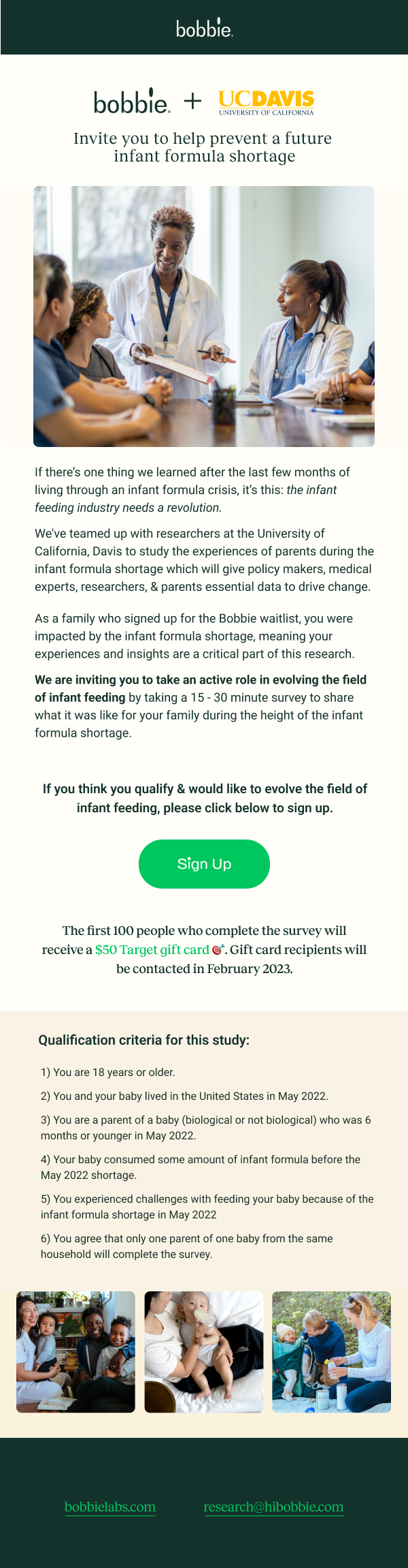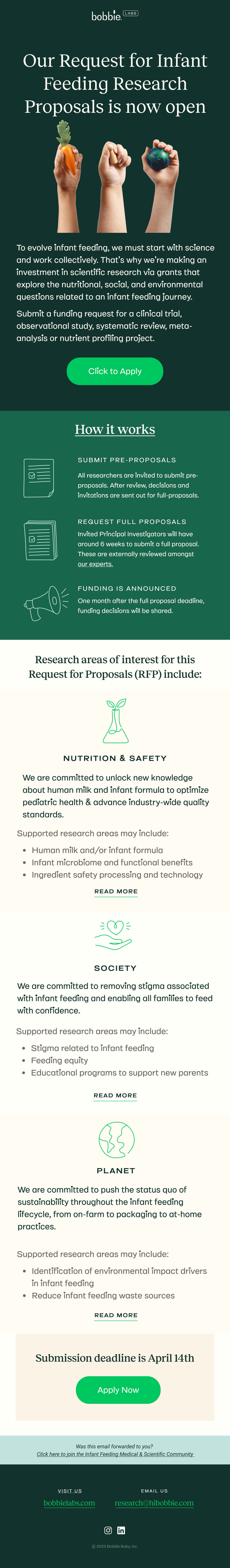 Bobbie Medical & Labs emails including emails for Request for Proposal, research for Universities, and Journal Clubs for nurses and pediatricians.