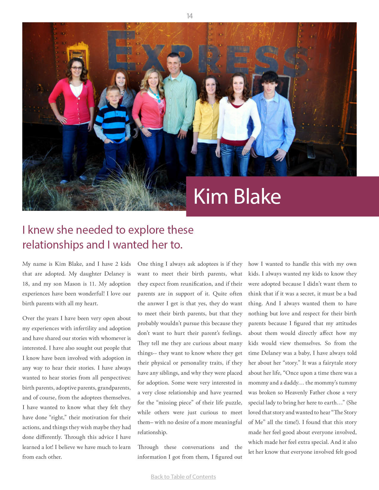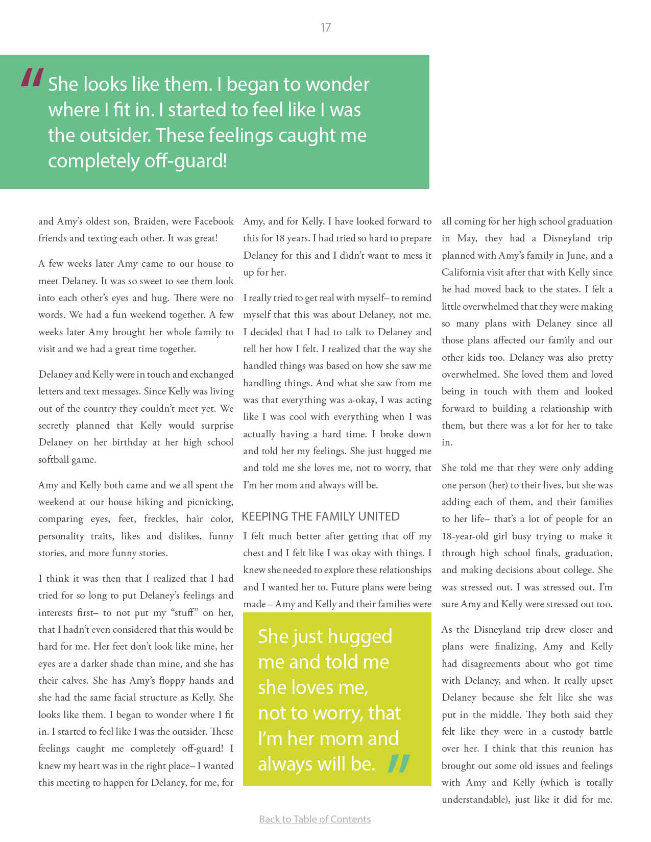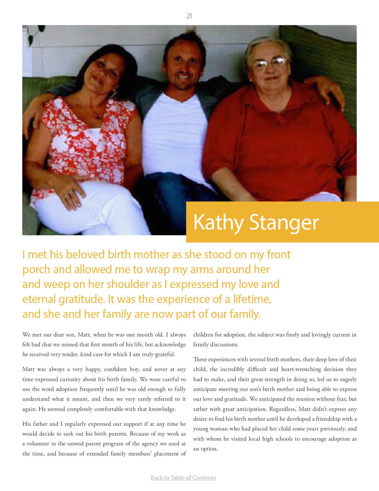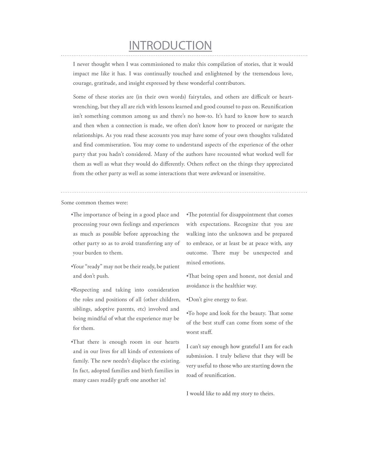 A compilation of stories about people finding and searching for love ones through adoption.
